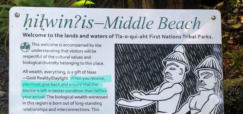 In Tofino stand ich also an einem traumhaft schönen Strand und lese „Wenn du so einen schönen Ort besuchst, stell sicher, dass du ihn in einem besseren Zustand verlässt, als du ihn selbst vorgefunden hast.“